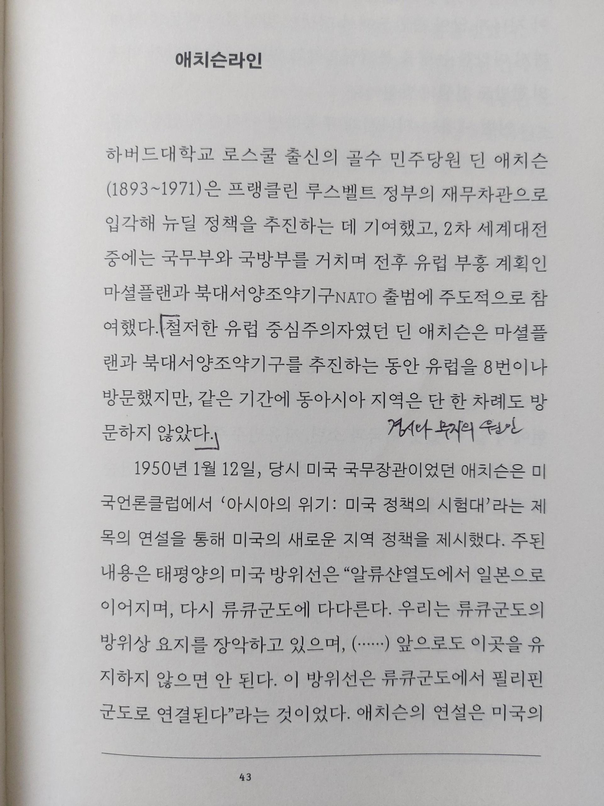 2. 철저한 유럽 중심주의자였던 딘 애치슨은 마셜플랜과 북대서양조약기구를 추진하는 동안 유럽을 8번이나 방문했지만, 같은 기간에 동아시아 지역은 단 한 차례도 방문하지 않았다.