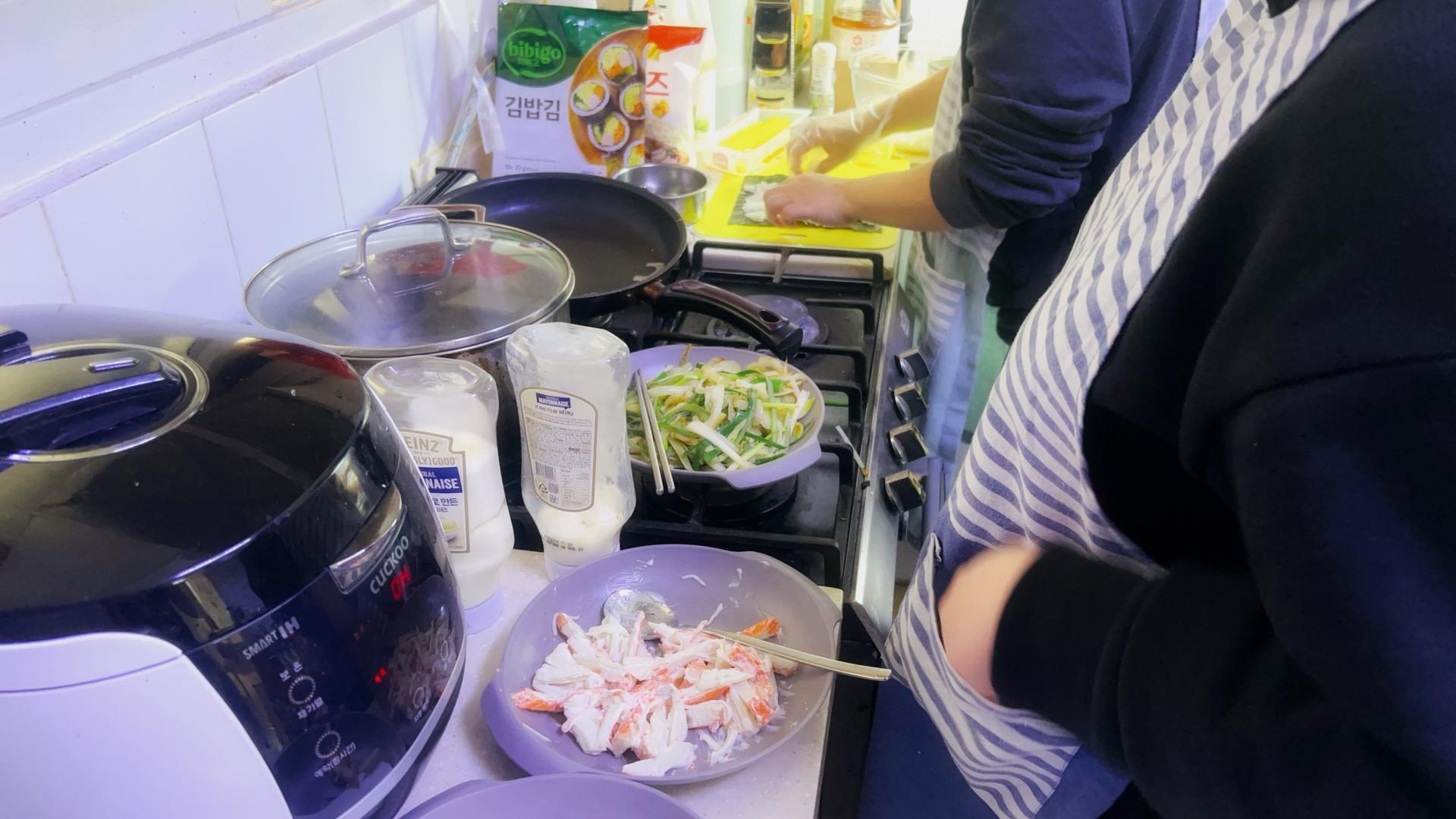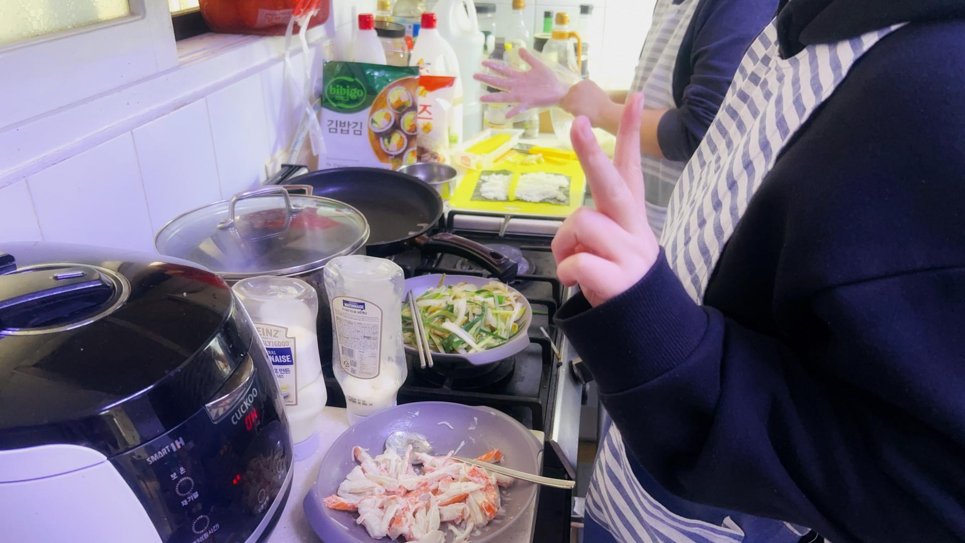 속재료는 크래미마요, 단무지, 양파+대파볶은 것, 추가로 스리라차소스 조금 추가해서 김밥을 말아봤습니다.