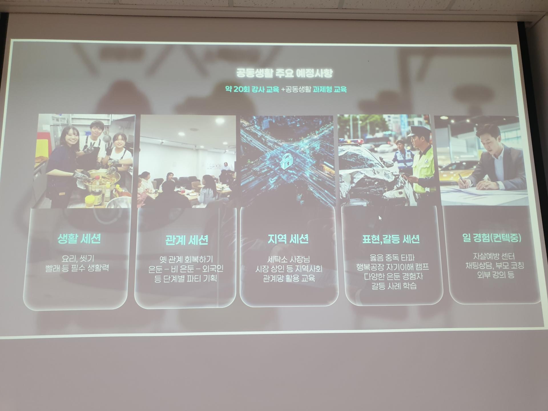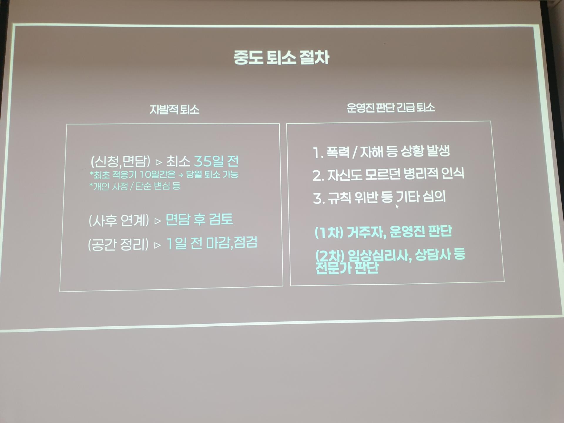 센터에 무언가를 하기에 은둔고립이 나아지는 척을 느끼며 만약 이상태에서 센터에서의 외래형 프로그램이 종료되거나 더 이상 센터로 나가지 않을때 실질적으로 당사자는 은둔탈출이 되지 않았기에 다시 재은둔고립이 시작된다고 하셨다. 그래서 안무서운회사는 셰어하우스를 운영하여 공동주거 방식을 채택한다고 했다. 1년 6개월 정도의 공동숙박 프로그램으로 당사자들끼리 같이 사는 연습을 해보면서 사회로 나가는 자립을 기른다고 하였다. 이때 셰어하우스에 들어가기 위해서는 정신질환이 있는 당사자들도 있기에 임상병리사,심리상담가,의사분들과도 협업하여 참가자들을 검사한다고 하였다. 그리고 이렇게 참여자들을 뽑아서 같이 생활해보면 첫 3개월은 거의 파국이라고 한다. 이유는 은둔고립당사자들은 대체로 혼자 살았고 집단생활에 익숙치 않아서 같이사는사람들과 엄청난 갈등을 일으키며 대부분이 관계를 끊어버리는 형태로 문제를 덮었지만 이곳에서는 갈등을 서로 풀거나 합의해야 같이 살 수 있기에 이 시기가 엄청 파국이라고 하였다. 또한 이 과정에서 싸움도 빈번히 일어난다고 한다.