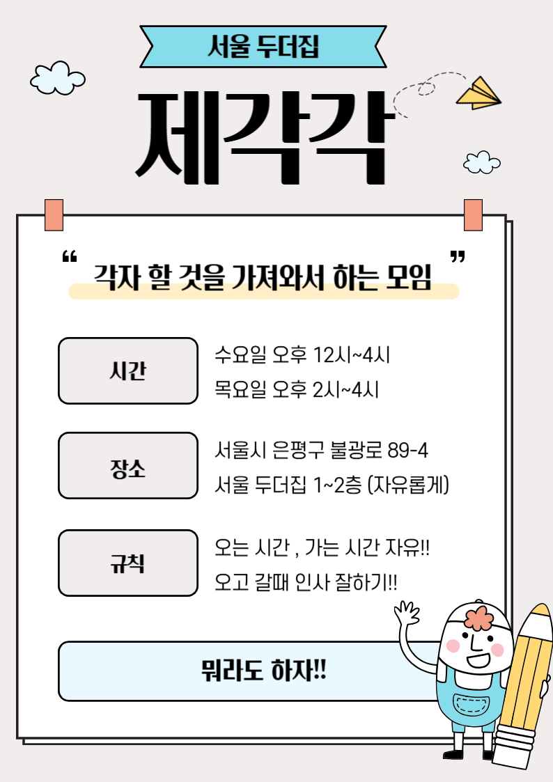 이 동아리는 서로 모여 각자 할 일을 같이 해보는 모임입니다.